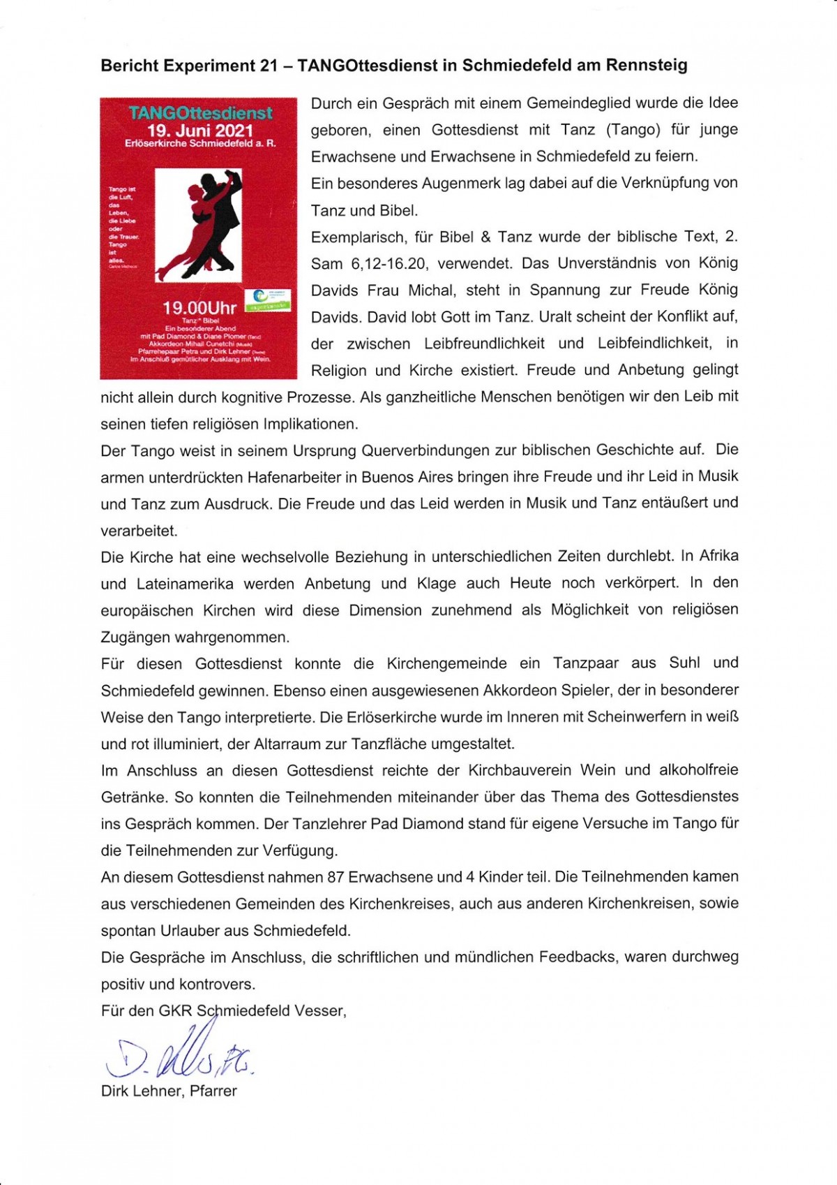 Der Kirchengemeindeverband Schmiedefeld Vesser plant am Samstag, 19.06.2021, um 19.00Uhr, in der Erlöserkirche in Schmiedefeld, einen Tango Gottesdienst.