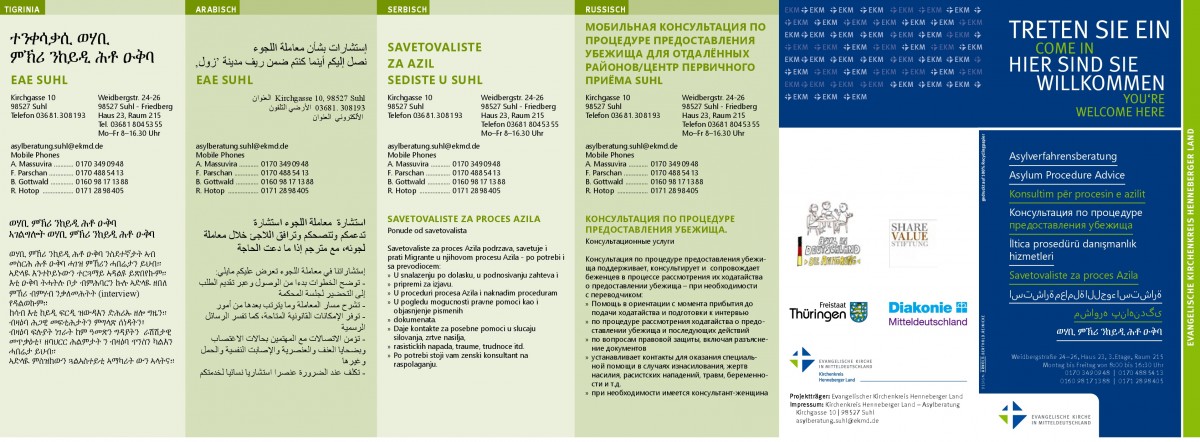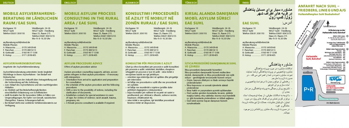 Die Migrationsberatung ist in der Kirchgasse 10, 98527 Suhl sowie im Familienzentrum „Die Insel“ Große Beerbergstraße 39, 98528 Suhl, Mobiltelefon: + 49 160 96377583.