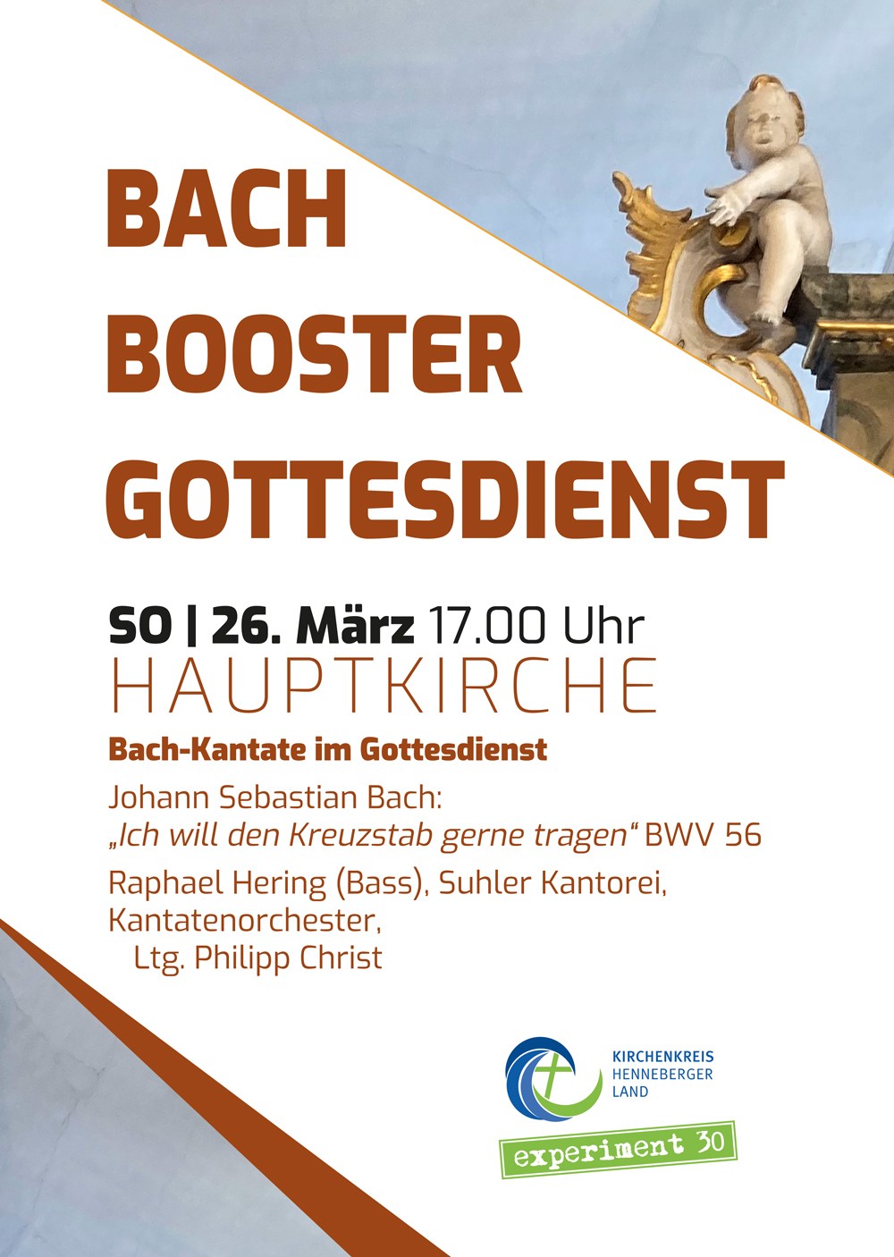 Viermal werden in diesem Jahr Kantaten von Johann Sebastian Bach in besonderen Kantatengottesdiensten in der Suhler Hauptkirche erklingen. Jeweils sonntags um 17.00 Uhr werden die Suhler Kantorei, Solisten und ein Kantatenorchester unter Leitung von Kantor Philipp Christ diese musikalischen Gottesdienste unter dem Titel „Bach-Booster-Gottesdienst“ gestalten. Dieses besondere musikalische Projekt wird ermöglicht als Experiment Nr. 20 des Erprobungsraums Kirchenkreis Henneberger Land. Den Auftakt bildet am Sonntag 26. März Johann Sebastian Bachs Kantate BW 56 „Ich will den Kreuzstab gerne tragen“. Solist der Solo-Kantate für Bass ist Raphael Hering (Meiningen). Der Kantatentext vergleicht das menschliche Leben mit einer Schifffahrt über ein stürmisches Meer und ist geprägt von der Sehnsucht nach einem seeligen Ende. Die Kantate schließt mit dem bekannten Choral „Komm, o Tod, du Schlafes Bruder“. Der Gottesdienst wird geleitet von Pfarrerin Catherine Heckert.