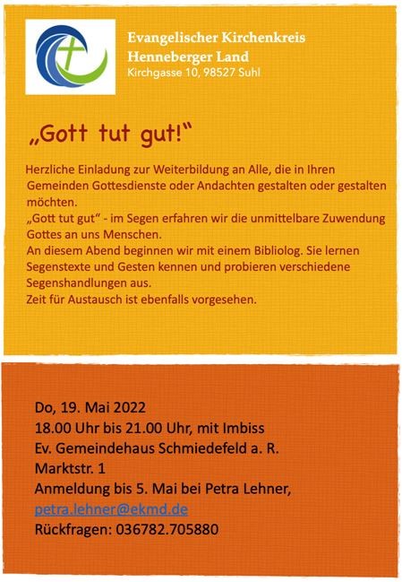 Herzliche Einladung zur Weiterbildung an Alle, die in den Gemeinden Gottesdienste oder Andachten gestalten oder gestalten möchten. „Gott tut gut“ - im Segen erfahren wir die unmittelbare Zuwendung Gottes an uns Menschen.