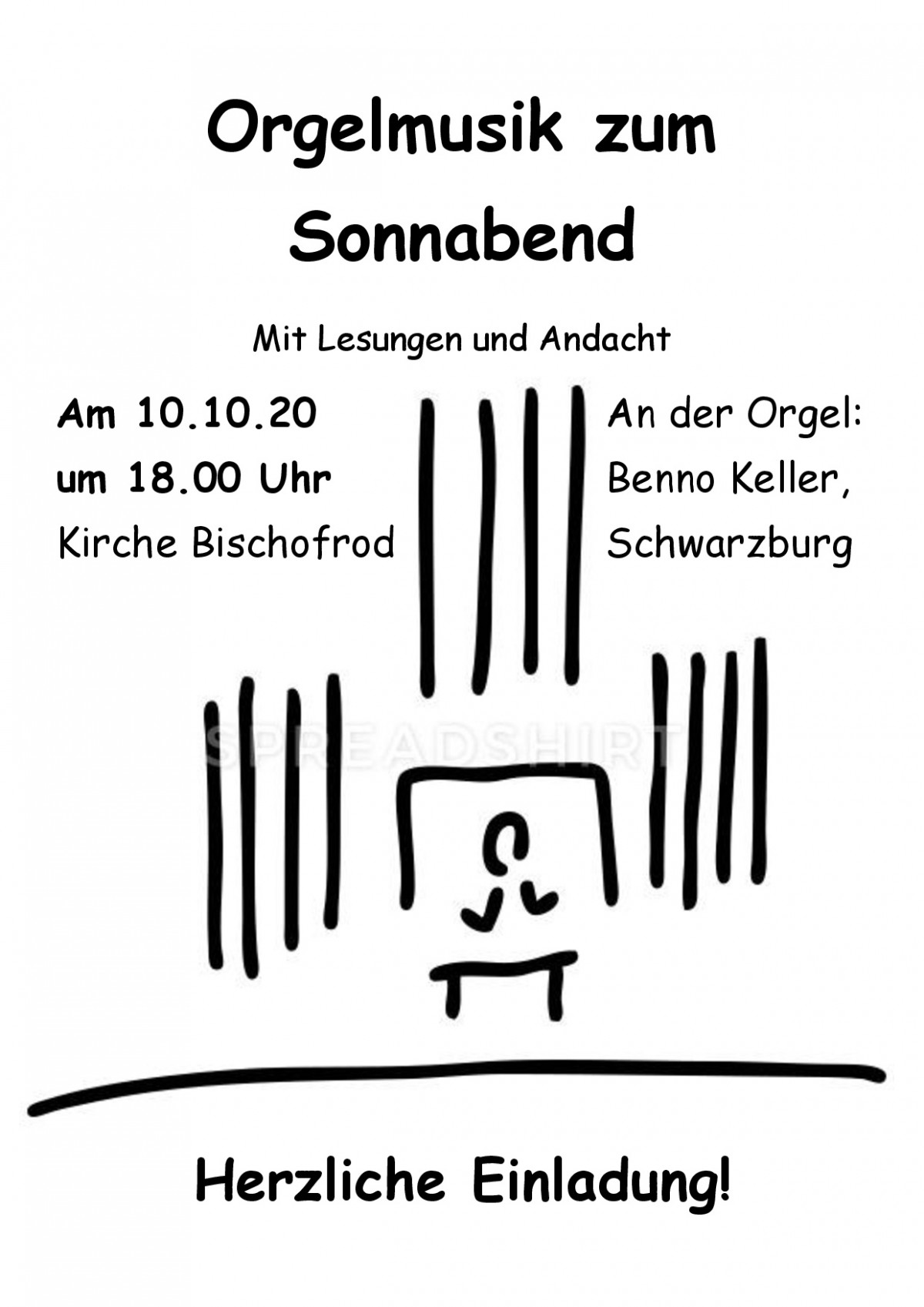 Sonnabend, 10.10. um 18.00 Uhr Orgelmusik zum Sonnabend in der Kirche in Bischofrod Haben Sie die Bischofröder Orgel schon einmal gehört? Seien sie herzlich eingeladen zur orgel-musikalischen Andacht mit Benno Keller aus Schwarzburg an der Orgel und einer Andacht mit Pfarrerin Constanze Greiner.