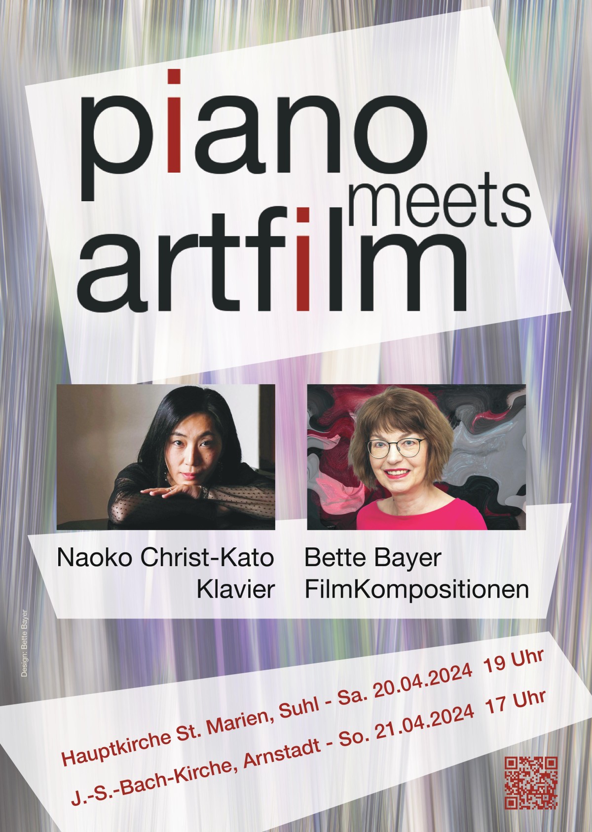 Die in Suhl lebende Pianistin Naoko Christ-Kato lädt zusammen mit der Künstlerin Bette Bayer aus Konstanz am Samstag, 20. April um 19.00 Uhr zum Klavierabend "piano meets artfilm" in die Suhler Hauptkirche St. Marien ein.