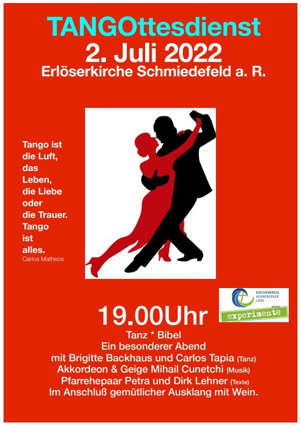 Am 02.07.2022 findet erneut ein Tangogottesdienst in der Erlöserkirche in Schmiedefeld a.R. statt