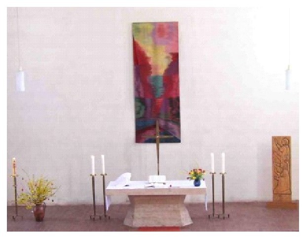 Die Kirche in Schwarza trägt den Namen Osterkirche. Der Wandteppich über dem Altar erinnert an den Ostermorgen: Die dunklen Farben unten erinnern an die Trauer um Jesus, der am Kreuz hingerichtet worden war. Darum steht das Kreuz vor den dunklen Farben des Wandbehangs. Nach dem Tod von Jesus blieben die Jünger in ihrer Trauer zusammen: ratlos, wie es nun weitergehen würde und ängstlich, ob auch sie verhaftet und getötet würden. Dennoch gingen am Morgen nach dem Sabbat einige Frauen zum Grab, um Jesus zu salben, wie es damals üblich war. Sie kamen mit der Botschaft, dass Jesus auferstanden ist, zu den staunenden Jüngern zurück, die die Botschaft ganz unterschiedlich aufnahmen: die einen vergaßen alle Furcht und rannten los, um selbst zu sehen und sich zu überzeugen, ob es wahr ist, was die Frauen sagen. Thomas dagegen wollten Jesus erst mit eigenen Augen sehen. Wieder andere begegneten Jesus, als sie unterwegs waren und erkannten erst, dass Jesus selbst mit ihnen redete, als er mit ihnen am Abend das Brot teilte. So erzählt die Bibel davon, dass die Jünger ganz verschiedene Erlebnisse hatten, die sie aber alle zur gleichen Überzeugung brachten: Jesus ist auferstanden! Plötzlich war ihnen ein Licht aufgegangen: Das Licht zerriss die Dunkelheit, in der sie saßen – deshalb scheint das Licht auf dem Wandteppich auch von oben, von Gott her, in die Dunkelheit hinein und geht nicht von unten auf. So begegnet der Auferstandene bis heute jedem auf ganz unterschiedliche Weise, doch die Überzeugung ist dann die gleiche: Jesus lebt, er ist auferstanden! Das befreit und verändert unser Leben. Außerdem steht in der Osterkirche – wie in vielen anderen Kirchen auch – eine Osterkerze, hier ganz links am Bildrand. Wo es einen Osternachts‐ oder Ostermorgengottesdienst mit einem Osterfeuer vor der Kirche gibt, wird die neue Osterkerze am Osterfeuer entzündet. Dann wird sie in die dunkle Kirche hineingetragen mit den Worten: „Christus ist das Licht!“ , worauf die Gemeinde antwortet: „Gott sei ewiglich Dank!“ Die Osterkerze wird dann bis zum nächsten Osterfest in jedem Gottesdienst angezündet, also auch bei Hochzeiten oder Trauerfeiern. Sie erinnert immer daran, dass der Tod nicht das letzte Wort über unser Leben hat, sondern Gott, dass wir seinem Licht entgegengehen. In der Passionszeit steht sie zwar nicht mehr vorn im Altarraum, wird aber auch angezündet, um daran zu erinnern, dass alles Leid ein Ende hat: auch das Leiden und der Tod von Jesus Christus ist nicht das Ende, sondern ihm folgt die Auferstehung: der Neubeginn, den Gott schenkt. Das Lindeholzrelief von Hildegard Hendrichs auf der rechten Seite zeigt Menschen, die das Licht des Ostermorgens wahrnehmen.