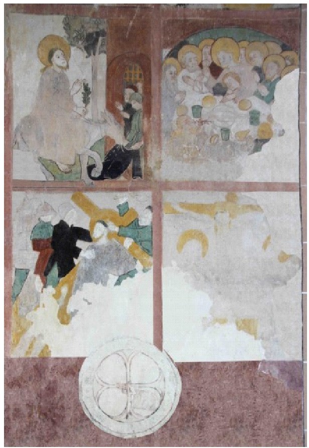 Der symbolträchtige Einzug Jesu in Jerusalem auf einem Esel. Damals jubelten die Menschen Jesus zu. Sie hatten hohe Erwartungen an Jesus: Endlich wird er die ungeliebten römischen Machthaber vertreiben und seine Herrschaft aufrichten! Endlich werden sie wieder frei sein! Ihn hatten sie in den letzten Jahren erlebt als einen, der ihren Sorgen zuhört, ihre Krankheiten heilt und ihnen Brot gibt. Die Erwartungen sind hoch: Wenn er ihr König wäre, würde es ihnen an nichts fehlen! Das Abendmahl: Gemeinschaft in größerer Zahl – nach der sich momentan viele sehnen. Für Jesus ist das Fest aber schon überschattet von dem, was kommt. Am rechten Bildrand eine größere Fehlstelle in der Wandmalerei. Da fehlt auch ein Gesicht. Das lädt ein, in die Gemeinschaft einzutreten und sich zu der Runde dazuzusetzen. Der nächste Tag: das Leiden. Die düsteren Andeutungen, die die Jünger nicht hören wollten, treten alle ein. Viele sind beteiligt. Kaum zu erkennen sind die aschfahlen Gesichter der Henkersknechte, sie stehen im krassen Gegensatz zu ihren bunten Gewändern. Gemeint ist: Wer andere tötet, verliert sein Gesicht, sich selbst. Erstaunlich aufrecht steht Jesus mitten im Bild. Vorn ist wieder eine große Fehlstelle in der Malerei, die uns eigentlich gefällt: Denn Leiden wollen wir am liebsten nicht sehen! Doch wieder könnten wir dort stehen, wo die Fehlstelle ist: Als Betrachter dieses stellvertretenden Leidens. Das letzte Bild: Jesus am Kreuz ist kaum zu erkennen. Das entspricht uns: Denn von Kreuz und Sterben wollen wir nichts hören. Darunter – nur schemenhaft ‐ zwei Personen. Der Sterbende ist nicht allein. Das kann tröstlich sein, aber auch Leid bedeuten: Die zu sehen, die durch den Tod einsamer werden wie seine Mutter Maria und Johannes, einer der Jünger, tut weh. Der Sterbende weist sie aneinander. Noch im Sterben sorgt er sich um andere. Dann ist es vollbracht.