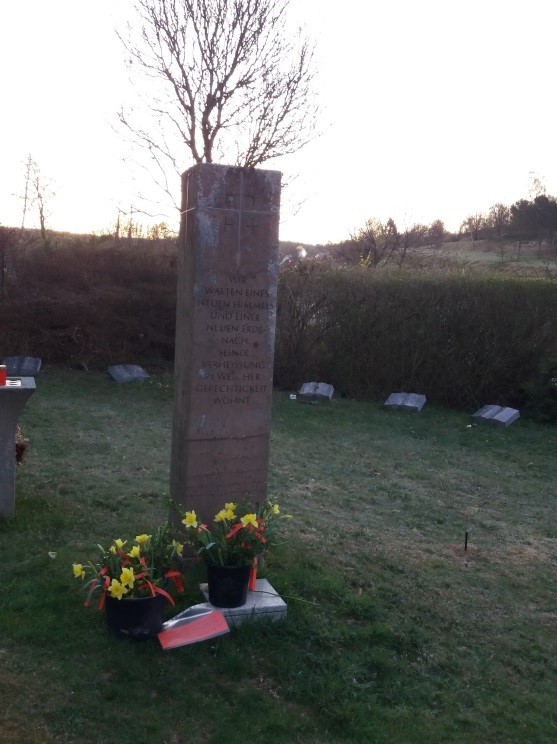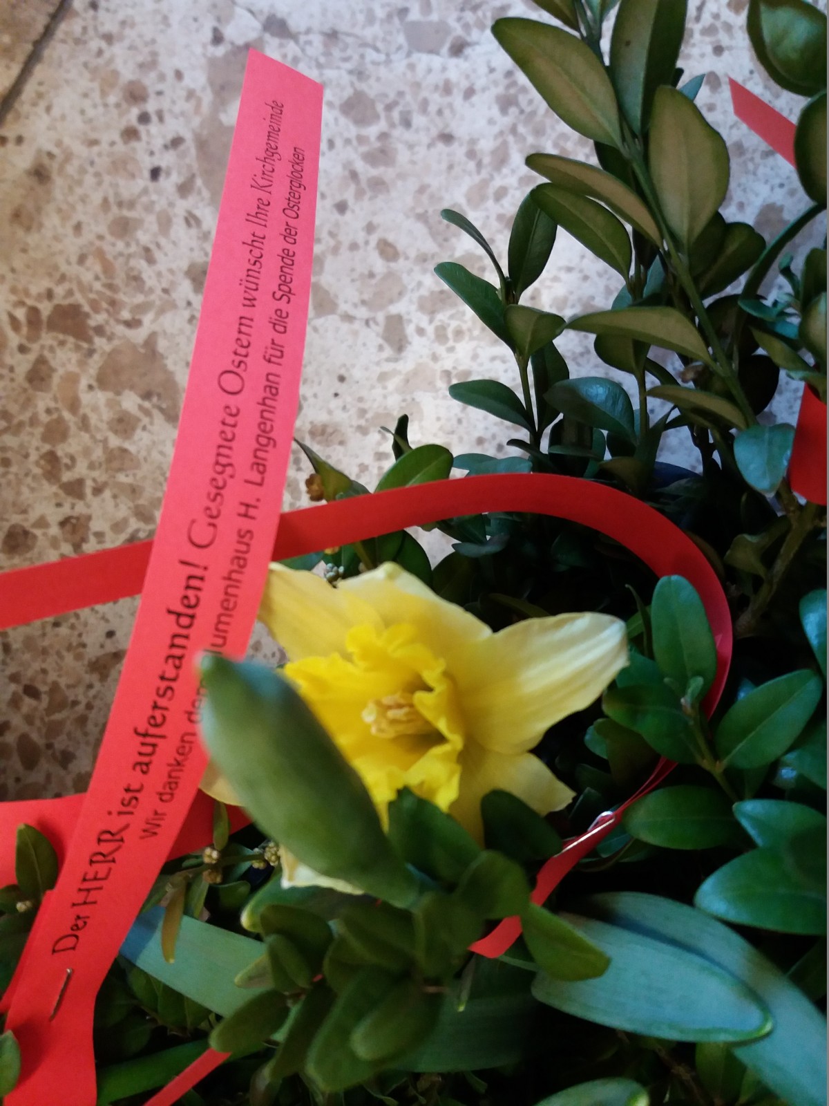 Letztes Jahr hatten wir am Ostersonntag und –montag auf dem Viernauer Friedhof an verschiedenen Stellen Eimer mit Osterglockensträußchen zum Mitnehmen aufgestellt. Das sah so aus: